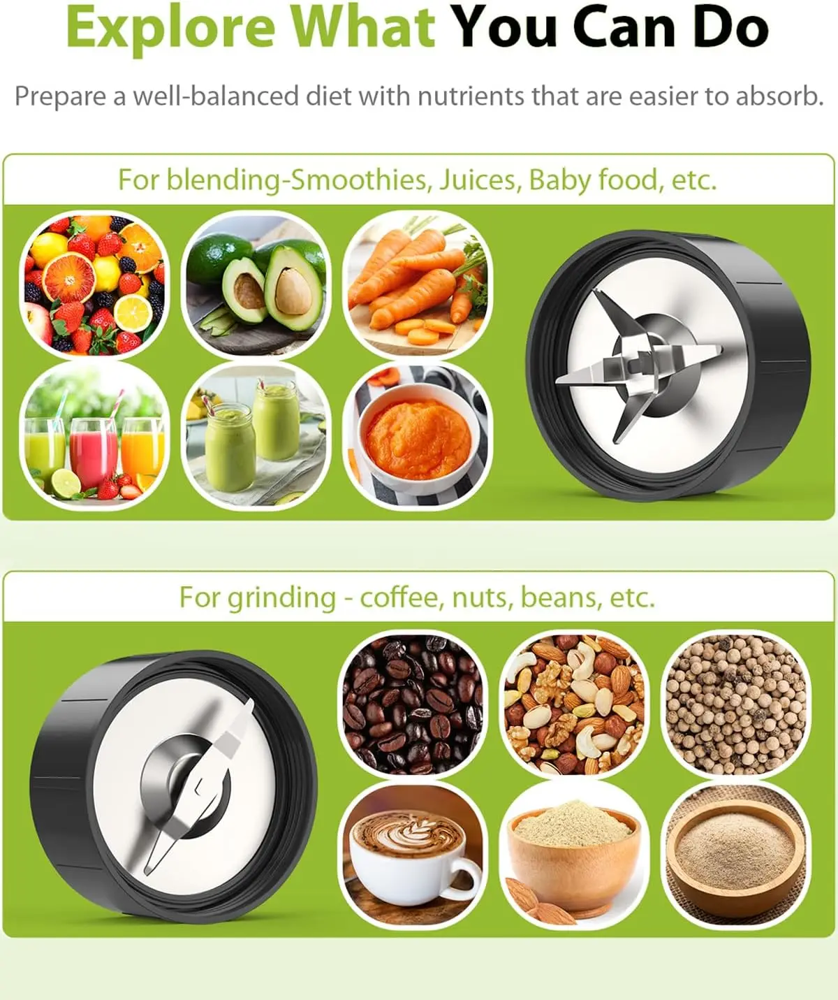 【Multi-Function Blenders】Powered by a stainless steel 6-leaf blade design ensures consistent and thorough blending. Whether you're in search of creamy smoothness or a perfectly powdery grind, our blender for shakes and smoothies interchangeable blade system delivers. The ability to swap between these two blade sets means you have a blenders for kitchen that truly meet your every need.